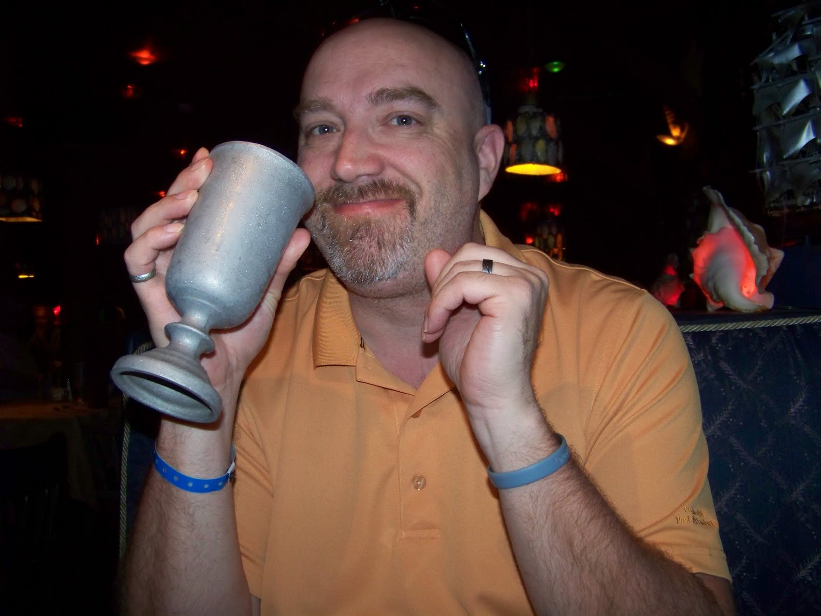 After we got back to the pier, we cleaned up our equipment then returned to the dive shop. From there we went back to our hotel and got cleaned up for dinner. We had a big dinner ahead of us. We had a $100 gift certificate to The Buccaneer, courtesy of La Cabana (for the time we spent at an owner’s update). Jim was looking forward to the dinner since he secretly wishes he could be a pirate. The restaurant didn’t disappoint. There was half a ship in the entry room of the restaurant. Each table had its own aquarium and was set with goblets and huge plates and silverware. It reminded me of what you see in pirate movies. Very cool!