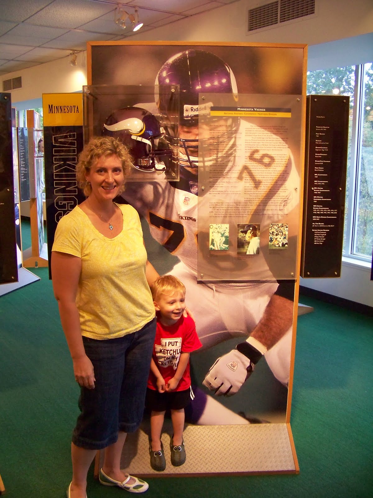 As we were leaving, we walked through the gift shop. My husband, being the loving, attentive, devoted man he is, told me to pick something out for my anniversary gift. I am now the proud owner of a Pro Football Hall of Fame sweatshirt… and a t-shirt that has all the Vikings in the Hall listed. Yes, I am a spoiled wife. Some women want flowers or chocolate for their anniversary. I was thrilled to see the Hall of Fame and get these souvenirs.